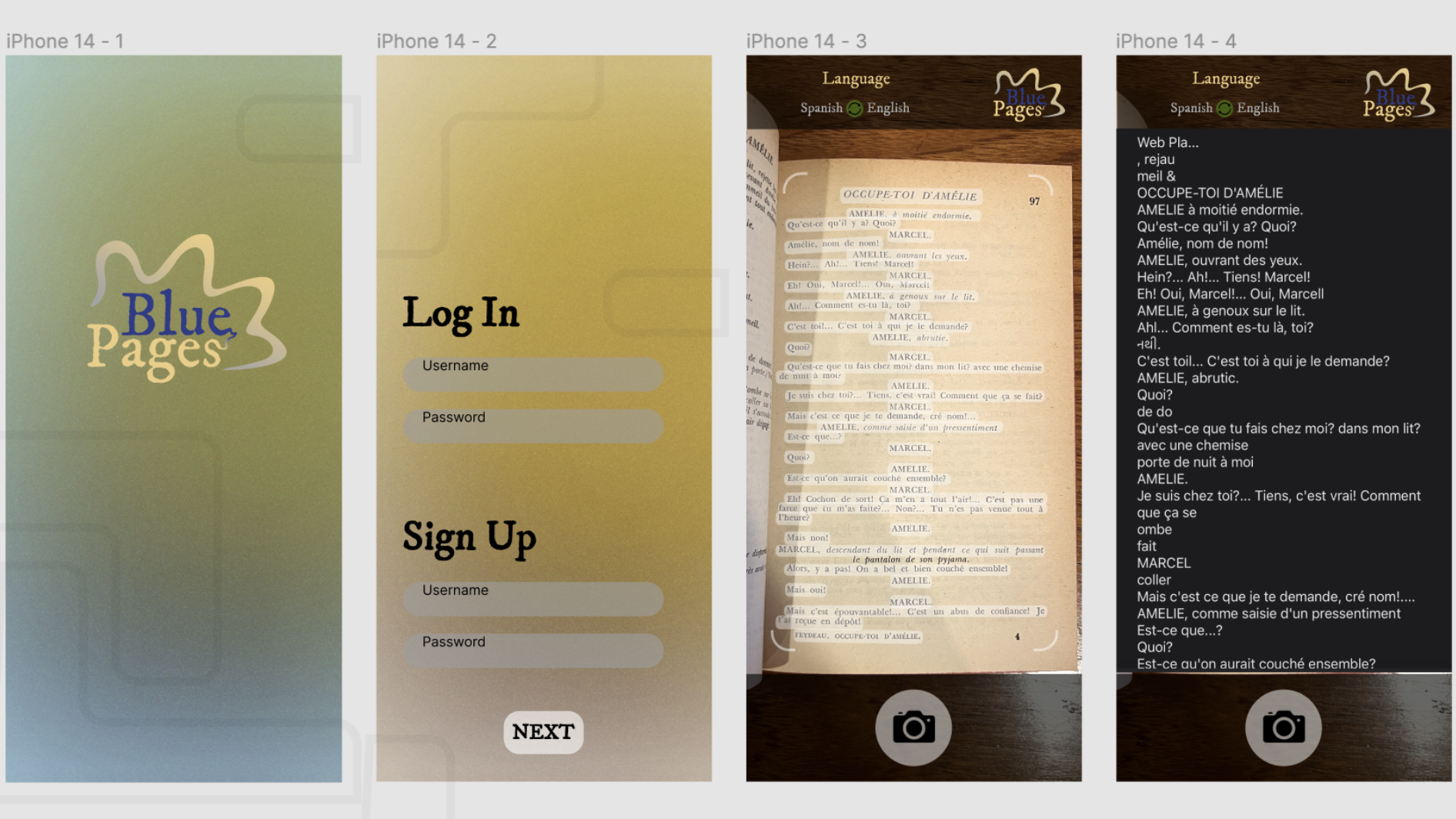 After all of the research and planning work, I made my prototype frames for Blue Pages. It shows the basic function of the app, with the scanning ability and translation.