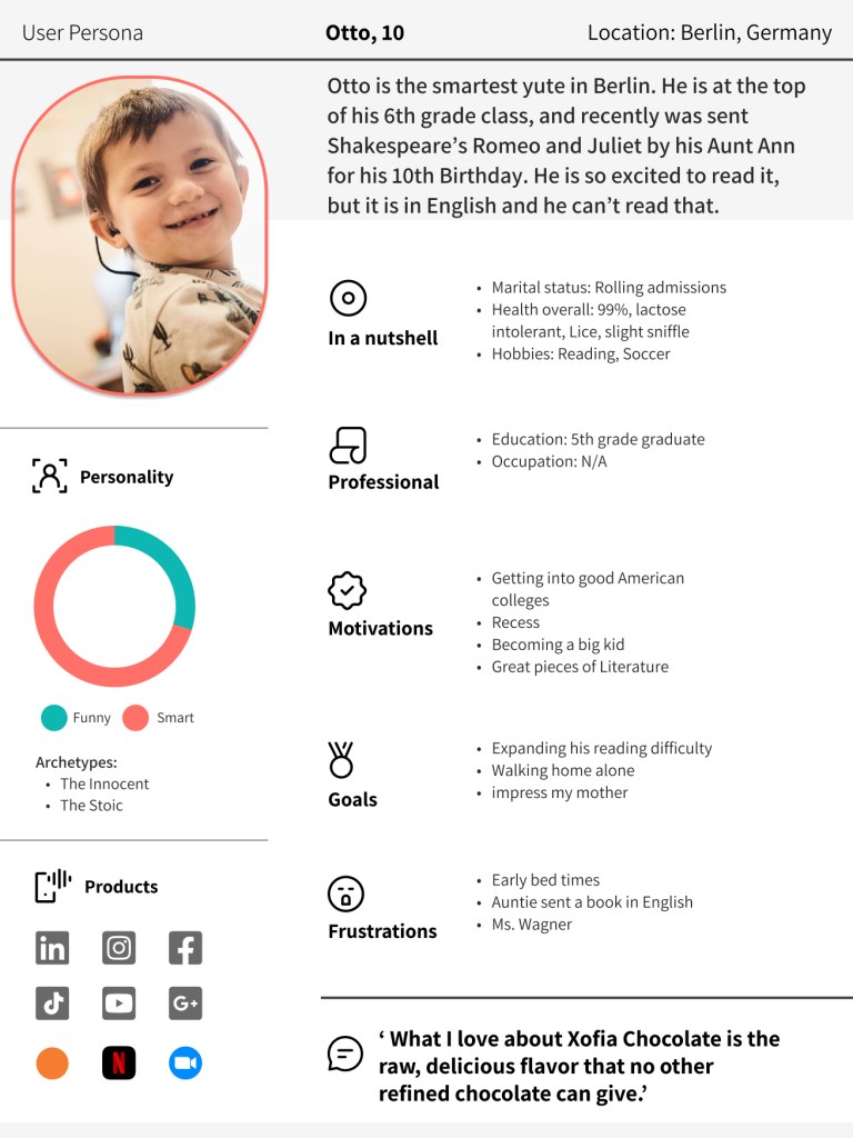 My research consisted of User journey and persona maps. I envisioned the problems that a young reader could run into, and used the it helped me conceptualize how Blue Pages could change the world. Here is Otto, a young reader who was gifted an English Shakespeare book from his aunt. Despite Ottos brilliance, he speaks German and is only 10 years old, so he will need some help to read the book.